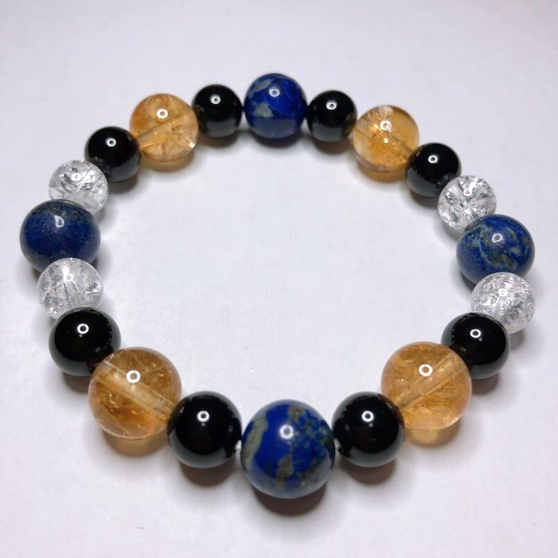 美しい色調の10mmシトリンと地球のような模様の10mmラピスラズリを使用したブレスレットです。シトリンもラピスラズリも非常に人気の高い石です。