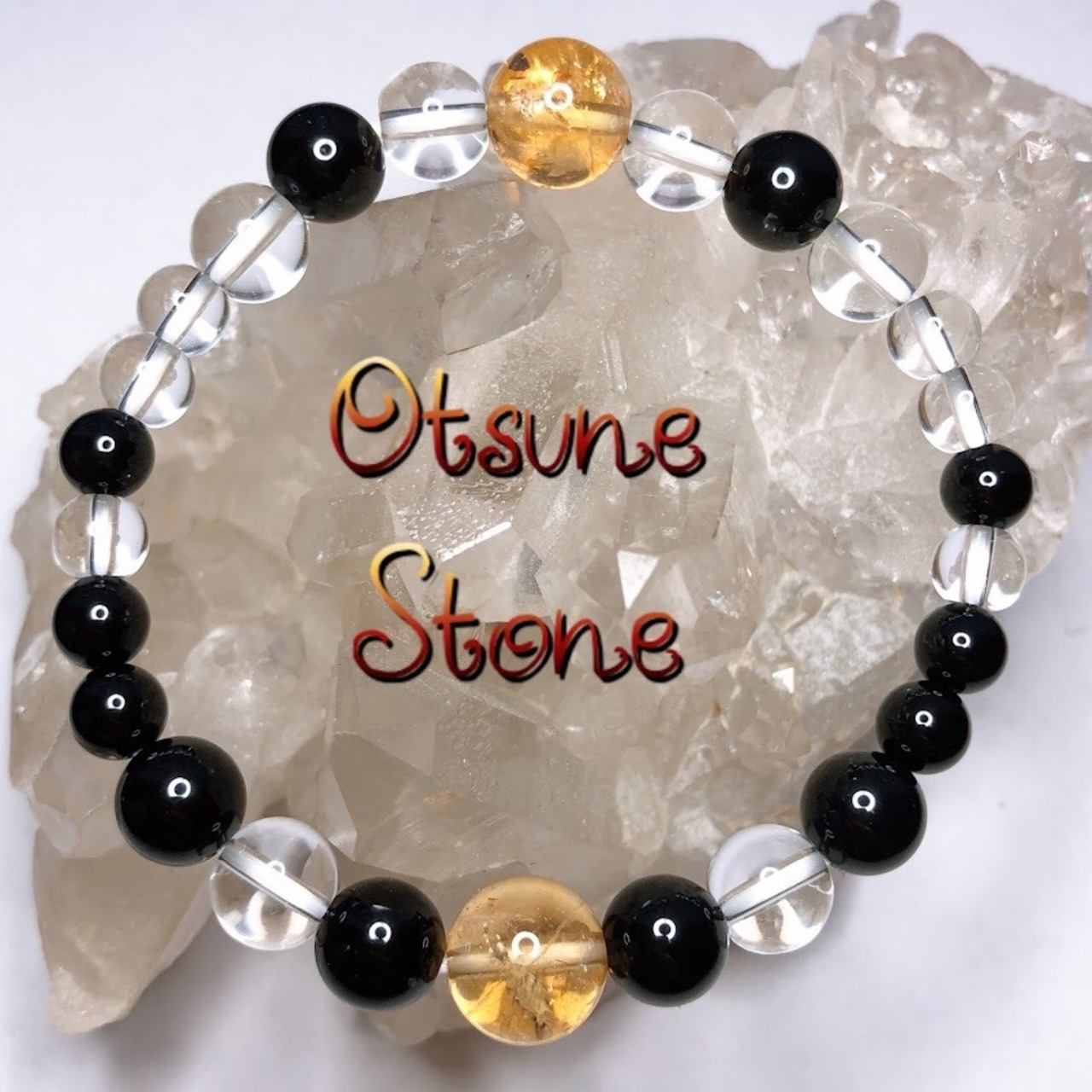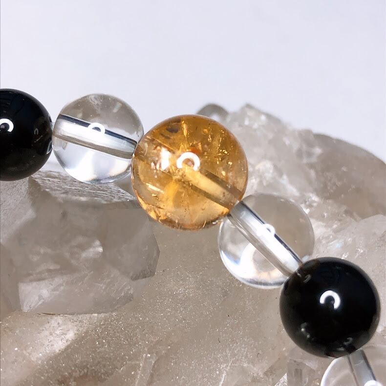 四柱推命などの占いで使用する陰陽をイメージした、水晶とオニキスのシンプルなブレスレットに、美しい10mmシトリンを入れました。シトリンの美しさが際立ちます。