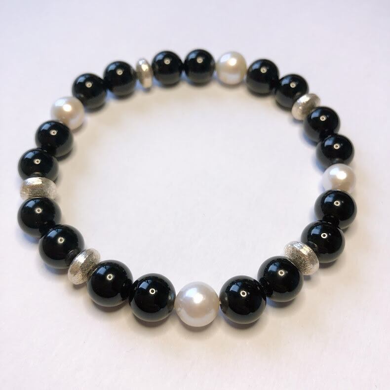 落ち着いた雰囲気のオニキスの中で、淡水パールの美しさが際立ちます。