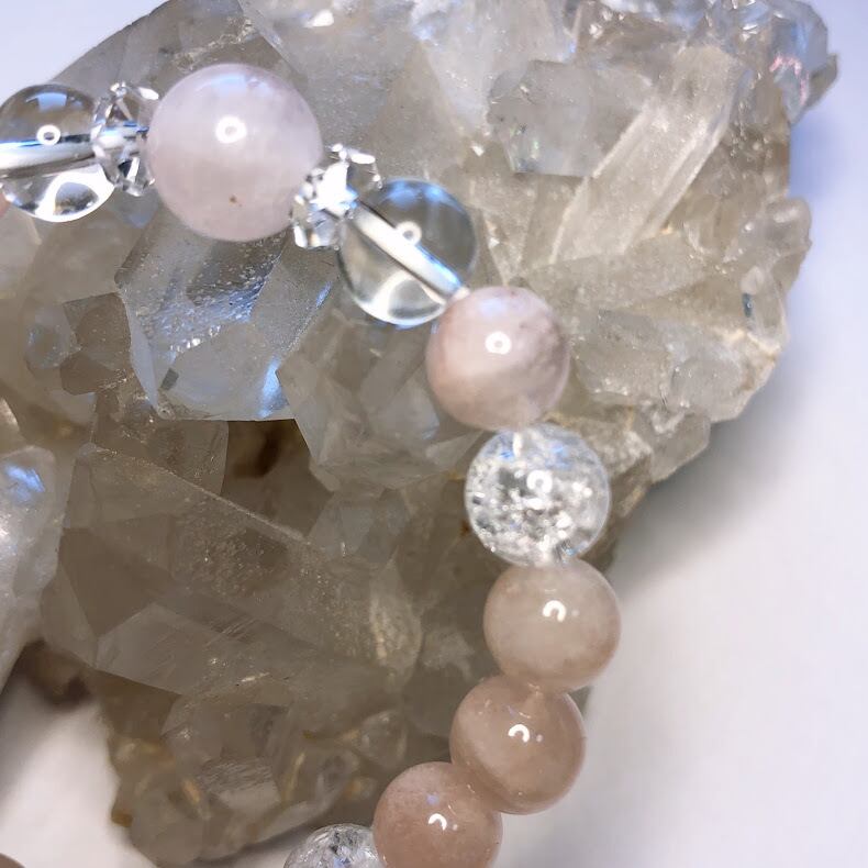 人気のモルガナイトと水晶を合わせた美しいブレスレットです。薄ピンクのモルガナイトは愛の石とも呼ばれ、身に着けた人に愛や癒しをあたえてくれます。ピンクは女性の魅力を最大限に高めてくれます。